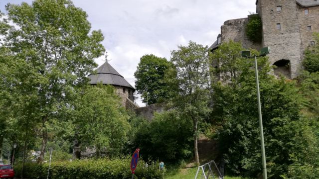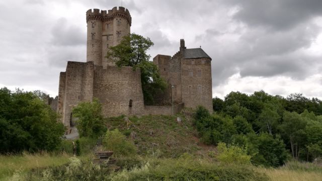 Nachdem das dann aufgehört hat sind wir locker flockig auf die Fahrräder gehüpft (a.k.a. „haben unsere kaputten Knochen auf die E-Bikes geschleppt“) und sind losgefahren, um uns dann doch mal die beiden Schnuckel-Burgen anzusehen. Die sind auch tatsächlich ganz hübsch, wie sie da so auf ihren Felsenhügelchen mitten im Tal sitzen. Dazwischen das Flüsschen Lieser, das früher mal irgendwann die Grenze zwischen den Fürstentümern Trier und Luxemburg war. Da macht diese ungewöhnliche Burgsituation dann schon wieder mehr Sinn, man musste ja auch damals schon den bösen, bösen Nachbarn immer gut im Auge behalten.