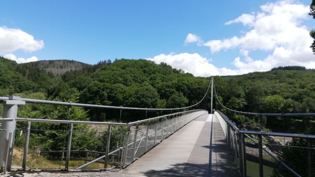Ein sehr gemütlicher Radweg entlang des Ufers der einzelnen Talsperren mündet dann unterhalb von Vogelsang an eine Brücke. Die ist schon beeindruckend, aber danach wird es echt hart: Es gilt, 16% Steigung über 600m zu bewältigen…Nein, da ist auch bei uns mit E-Bikes dann mal „Schluss mit lustig“, man entdeckt dann schnell den Nutzen der Schiebehilfe.