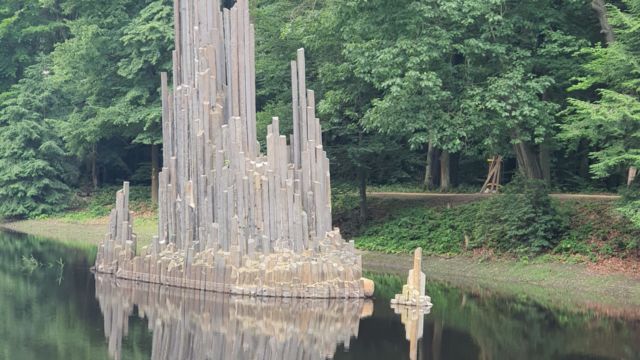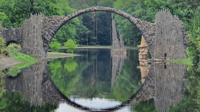 Nächster Stop ist dann ein absoluter Foto-Hotspot (bekannt auch aus dem Windows-Anmeldebildschirm): Die Rakotzbrücke bei Kromlau. Auf den meisten Fotos wirkt das immer so richtig massiv und gross, aber vor Ort ist es dann doch eher einfach nur „nett“. Ja, vom richtigen Punkt aus sieht das schon sehr nice aus mit dem kompletten Kreis und die Form der „Brücke“ ist schon auch extrem rund, aber insgesamt ist da eher nix „Imposantes“ dran. Juliane beschrieb es ziemlich treffend als „Mittelalter-Disneyland“. Dieses Deko-Objekt in einem Park mit wunderschönen Rhododendren ist nicht annähernd begehbar, sondern an der obersten Stelle geschätzt 1-2m breit, rundherum abgesperrt und wirklich nur als Dekoration gebaut. Da werden sechseckige Stelen aus Basalt (?) mit Beton zusammengekleistert… Ja, es sieht nett aus, ist ein nettes Motiv, aber mehr als „nett“ (die kleine Schwester von Sch***) bleibt nunmal als Fazit nicht hängen.