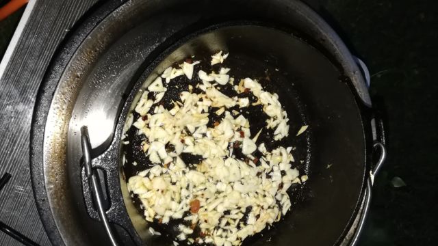 - Knoblauch und die Chilies in das Bratfett geben, anschwitzen und glasig werden lassen.