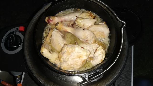 - Olivenöl im DOpf erhitzen und die Hühnerteile rundherum goldbraun anbraten und zur Seite stellen.