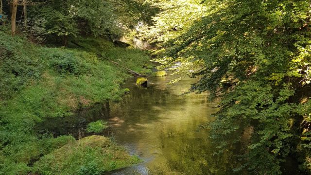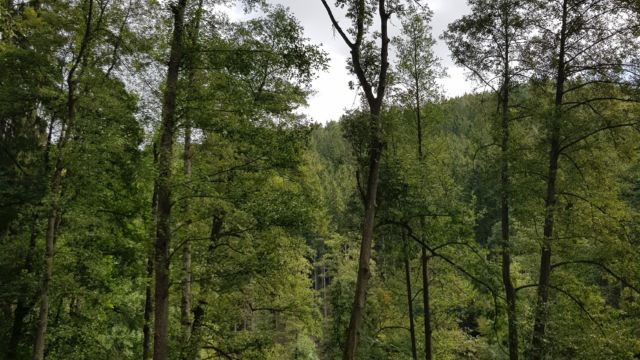 Ich – Brückenprofi ohne gleichen – bin froh, heil über die Brücke zu kommen und Harry freut sich auf ein Bier: Auf der anderen Seite befindet sich ein Ausflugslokal. Was dem einen sein Bier, ist dem anderen sein Mohnstrudel – noch warm und dermaßen lecker, dass ich gar nicht mehr aus dem Loben herauskommt: „Schmeckt wie Mohnpielen zu Weihnachten“. Dermaßen gestärkt machen wir uns auf der anderen Flußseite auf den Heimweg. Diesmal verlassen wir die Eger und wandern durch den Wald zurück.