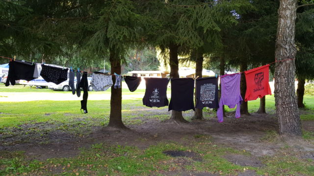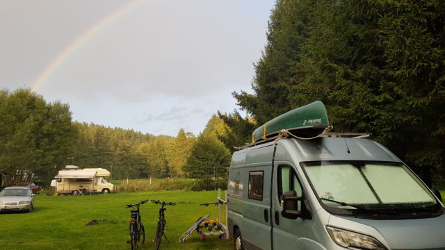 Heute ist Waschtag. Wir waschen uns, die Klamotten – das WoMo wird vom Regen gewaschen… Schließlich sind wir auf einem Campingplatz, da heißt es: ausnutzen. Und auch wenn die Outdoor-Dusche nicht nach 5 Sterne Hotel aussieht – sie ist herrlich warm.