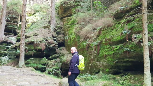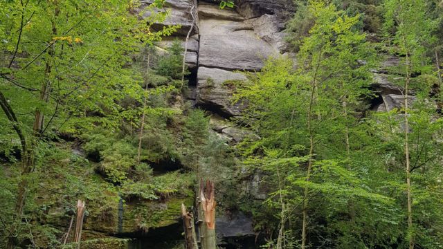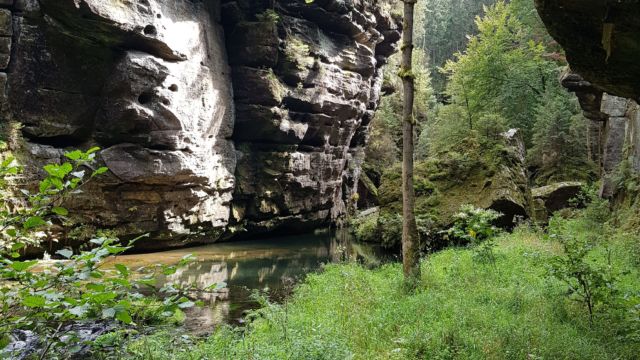 In Hrensko zu parken geht nur kostenpflichtig. PKW’s parken am besten beim Hotel Praha, Womo oder größere Gespanne können in Mezni Louka parken und die Tour in entgegengesetzter Richtung machen. Wir finden einen Parkplatz vor einer improvisierten Kaffeebar, Supermarkt oder was auch immer dieser Laden darstellen soll. Aber Parkplatz (5,00 €/Tag) und Kaffee (0,80 €/Becher) nehmen wir dankbar an. Um 11.00 Uhr sind wir dann so langsam abmarschbereit. Wir laufen am Hotel Praha vorbei und biegen ca. 200 m dahinter rechts in die Klamm ein. Was wir sehen ist vor allem eines: viiiiiel Gegend und grün. Überall ist Natur im Überfluss. Die Kamnitz fließt ruhig vor sich hin. An der einen oder anderen Stelle wird sie auch wilder. Felsen steigen rechts und links seitlich am Ufer hoch. Nach ca. 2 Kilometern geht es in die Edmund Klamm und nur noch per Boot weiter. Mit uns im Kahn: die Freunde der Cocker Spaniel. Eine Gruppe von rüstigen Senioren samt ihren insgesamt 7 Hunden, lässt vermuten wie es hier in der Hauptsaison aussieht. Der Bootsführer stakt 20 Minuten lang das Gefährt sicher durch die Kamnitz und erklärt uns, welcher Felsen was für eine Gestalt darstellen soll. Nur mit sehr viel Phantasie ist das eine oder andere zu erkennen.