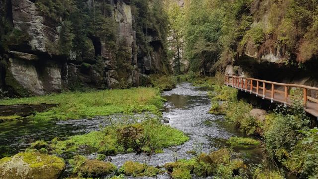 Und Action! Wir wollen und müssen uns nach dem gestrigen Ruhetag bewegen und die Böhmische Schweiz schreit danach erkundet zu werden. Also raus aus den Federn und los (wer braucht schon Frühstück oder Kaffee… :-). Wir fahren Richtung Hrensko – gerade mal ca. 20m km von hier – um in die Böhmische Schweiz einzutauchen. Heute steht das Prebischtor auf dem Programm. Vorher gilt es aber noch die Kamnitzklamm zu erkunden.