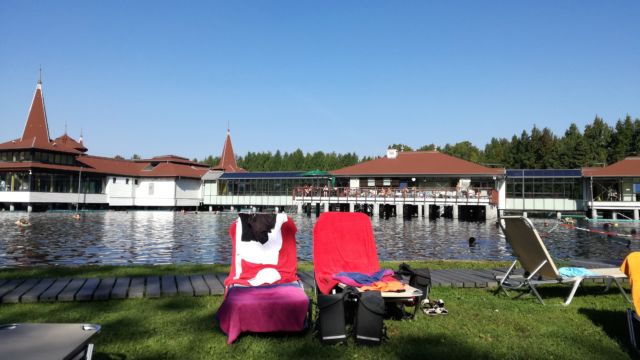 Wie am Vortag schon beobachtet, musste beim Frühstück erstmal der Träger der „goldenen Poolnudel“ ermittelt werden. Denn Schwimmen in diesem See ist echt nichts für den schwachen Kreislauf. Der wahre Schwimmer kommt da aufgrund der hohen Wassertemperatur auch nicht so wirklich vorwärts. Deswegen ist da echt eine Poolnudel oder ein Schwimmreifen angesagt. Nachdem das ja ein Heil- und Kurbad ist, mussten wir da natürlich rein. Also nach dem Frühstück mal kurz die Finanzen (in barer Fremdwährung) gecheckt, einen kleinen Schwimmreifen besorgt (die nimmt nur Bargeld => Finanzcheck) und für uns zwei dann ein 3-Stunden-Ticket für das Heilbad gekauft. Nach einem kleinen Orientierungslauf durch die oberseeischen Gebäude sind wir dann auf der Liegewiese gelandet und hatten uns unsere Sonnenliegen gesichert. Kurz drauf dann ins 33° warme Wasser .. hat schon was. Da tummelten sich neben uns noch so viele Poolnudelträger, dass wir für uns einzig verbuchen können, dass wir den Altersdurchschnitt wahrscheinlich dramatisch gesenkt haben. Naja, es kam natürlich, wie es kommen musste: Wir sind gesund, fit und wunderschöner denn je aus dem Wasser gestiegen, haben uns gesonnt (Wärme und Trocknen) und haben den Tag so richtig genossen.